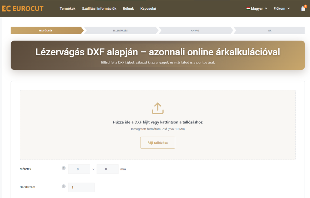 A lényege ugye az, hogy feltölti az ügyfél a DXF fájlt, és a weboldal az alapján automatikusan számolja az árat, nem kell árajánlatot kérni, és azonnal meg is rendelheti. Ilyen rendszere itthon nincsen senkinek sem, ezért bízok benne, hogy egy űrt fog kitölteni ez a fajta szolgáltatás.